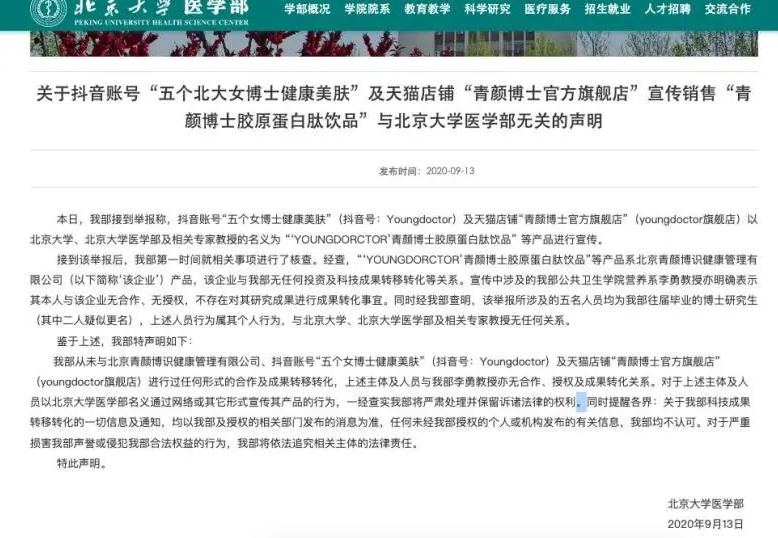 早在2020年,北京大学医学官网就曾发布声明与这一品牌“撇清关系”,声明称,“我部接到举报称,抖音账号‘五个女博士健康美肤’及天猫店铺‘青颜博士官方旗舰店’以北京大学、北京大学医学部及相关专家教授的名义为‘YOUNGDORCTOR青颜博士胶原蛋白肽饮品’等产品进行宣传……经查,该企业与我部无任何投资及科技成果转移转化等关系……同时经我部查明,该举报所涉及的五名人员均为我部往届毕业的博士研究生(其中二人疑似更名),上述人员行为属其个人行为,与北京大学、北京大学医学部及相关专家教授无任何关系。”