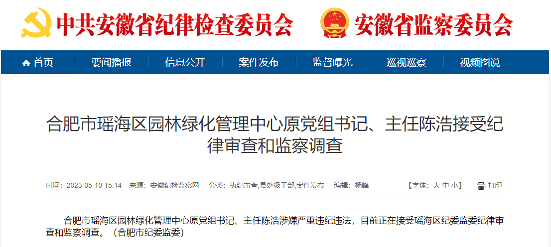 合肥市瑶海区园林绿化管理中心原党组书记、主任陈浩涉嫌严重违纪违法,目前正在接受瑶海区纪委监委纪律审查和监察调查。(合肥市纪委监委)