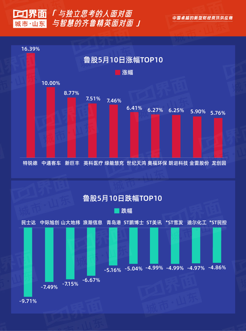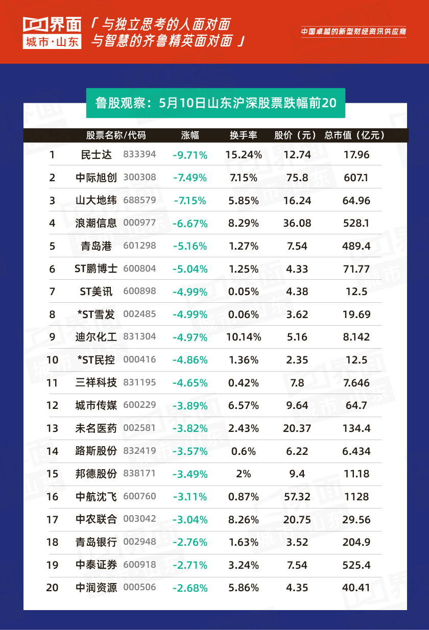5月10日,山东省内沪深股票有185只个股上涨,243只个股下跌;总市值过千亿的有万华化学(600309)、海尔智家(600690)、兖矿能源(600188)、青岛啤酒(600600)、山东黄金(600547)、中航沈飞(600760)、潍柴动力(000338)共7家,500亿-1000亿的共有6家,分别是华鲁恒升(600426)、歌尔股份(002241)、华电国际(600027)、中际旭创(300308)、浪潮信息(000977)、中泰证券(600918)。