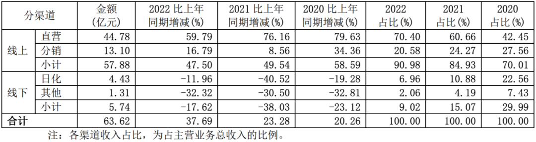 各渠道营收变化也更能佐证渠道变革的效果,自2017年开始三年间,珀莱雅日化渠道收入9.33亿、10.03亿、10.47亿,增速明显放缓的另一面,渠道重心转移效应逐渐显现,从2021年至今,珀莱雅线上渠道销售额占比稳定在80%左右,线上直营占比稳定在50%以上,在全部线上销售中占比在70%以上。