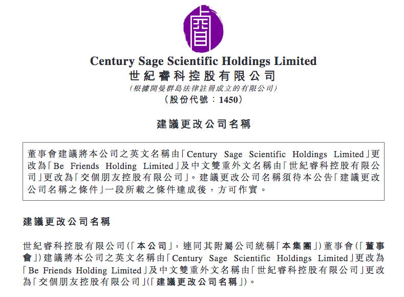 5月10日消息,今天港交所上市公司世纪睿科发布“建议更改公司名称”的公告,宣布拟将公司名称由“世纪睿科控股有限公司”更改为“交个朋友控股有限公司”,同时英文名也会更改为“Be Friends Holding Limited”。