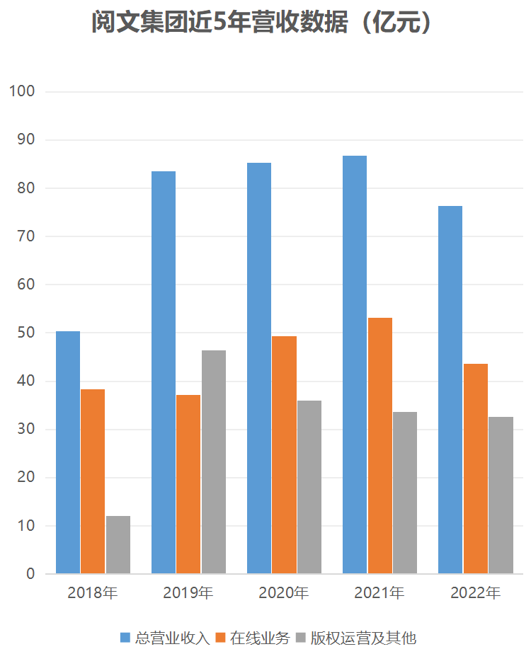 第三是版权业务,这也是程武一直强调的IP变现业务,2020年、2021年和2022年分别为35.94亿元、33.59亿元和32.62亿元,三年均不及2019年的46.37亿元。这部分收入不仅包含出售IP版权带来的收入,还包括制作、发行电视剧、电影等方面的收入,这一块收入占比量非常小,在1-2亿元之间。