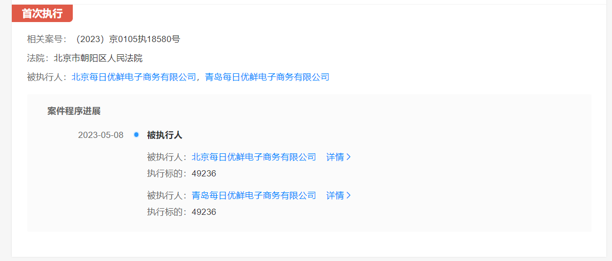 具体来看,5月8日,北京每日优鲜电子商务有限公司和青岛每日优鲜电子商务有限公司被北京市朝阳区人民法院列为被执行人,执行标的4.92万元,执行案号(2023)京0105执18580号。