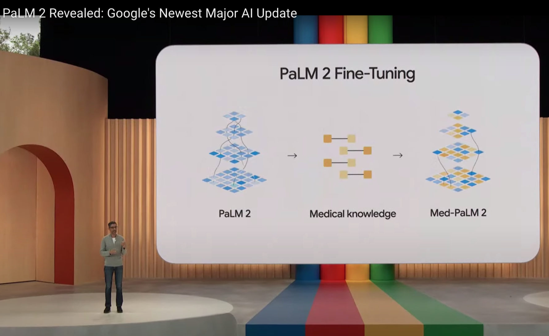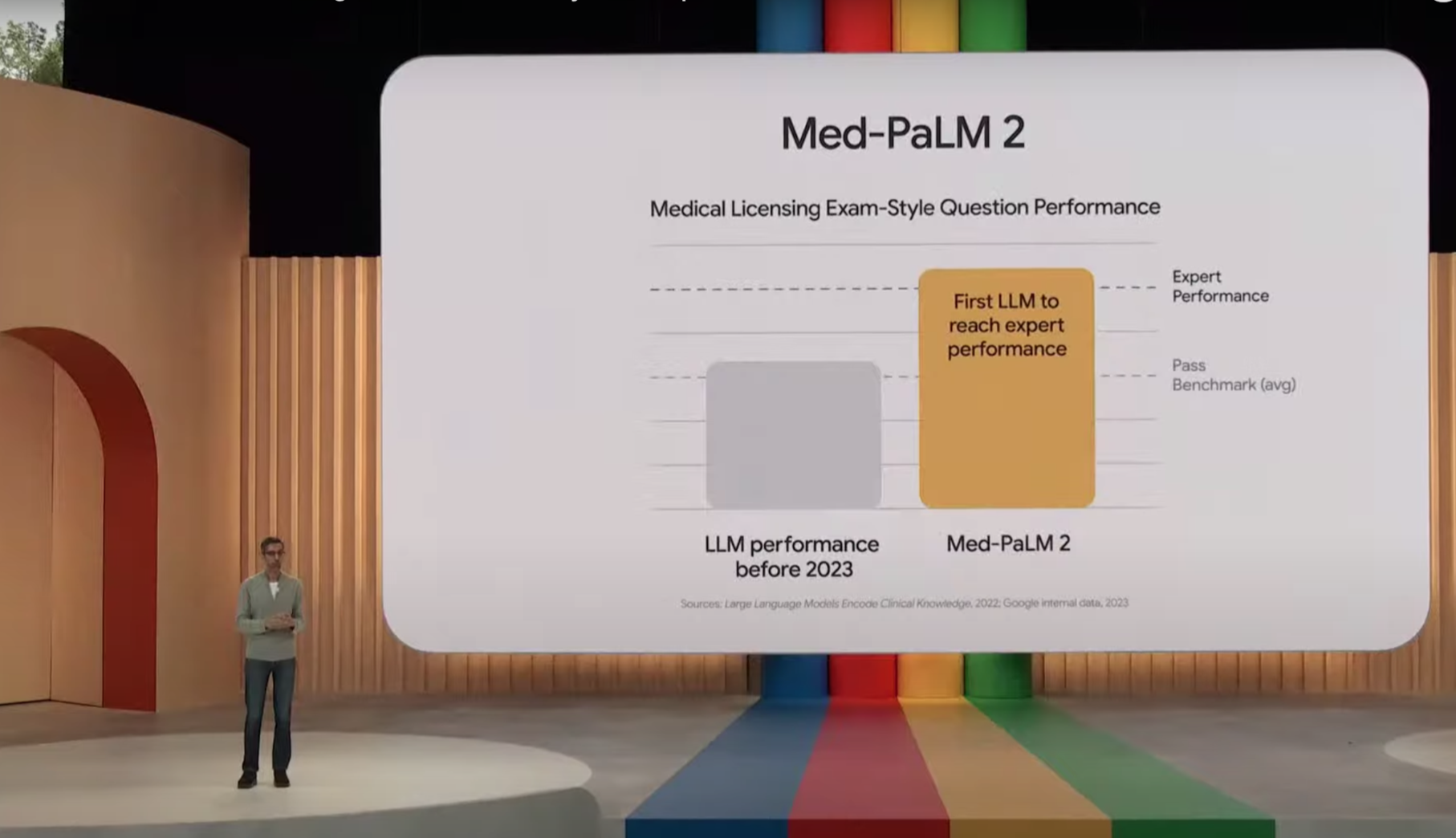 PaLM 2的多模态能力体现在能看懂和生成音频和视频内容之上,皮查伊在现场对这些能力进行了少量展示。他用谷歌内部基于PaLM 2针对医疗领域微调而成的Med-PaLM 2举例,后者是第一个在医学执照考试上表现出专家水平的专用语言模型,已经可以在医院看片室帮助放射科医生解读图像,可以根据X光片分析病人的状况,此后还将用于更多领域。