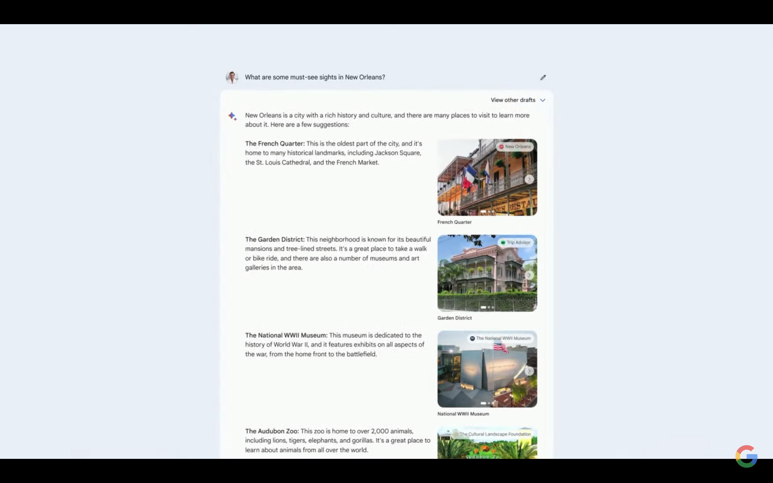 如果用户想查询关于某个旅游目的地的信息,Bard的表现像一个大众点评,可以向用户展示该处目的地附近的所有热门景点。