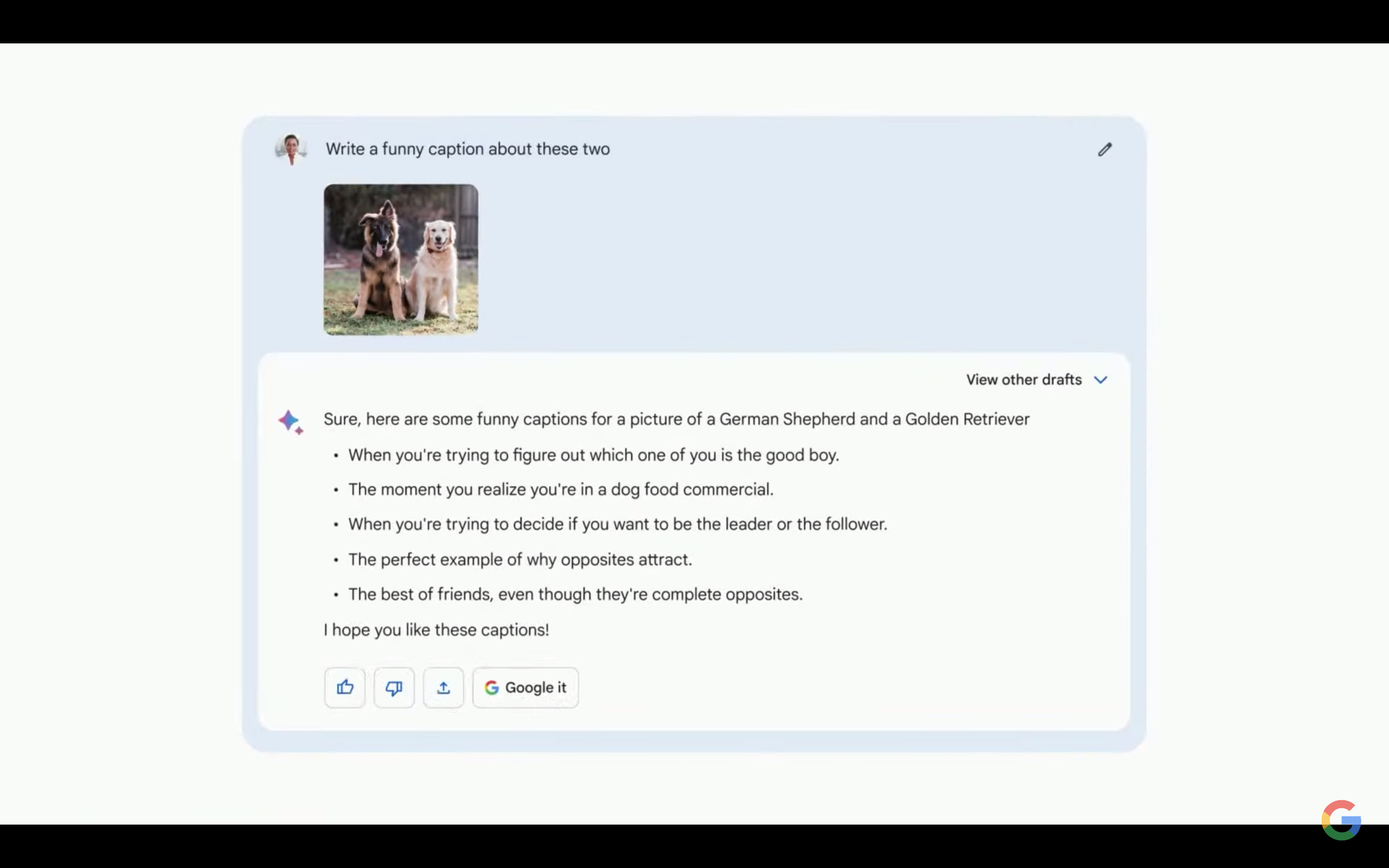 在文字之外,Bard可以做到很好的理解图片,可以根据图片信息抽象出文字。谷歌在现场进行了演示,如果发给Bard一个狗狗的照片,Bard可以根据图片来分析其中的有趣之处。