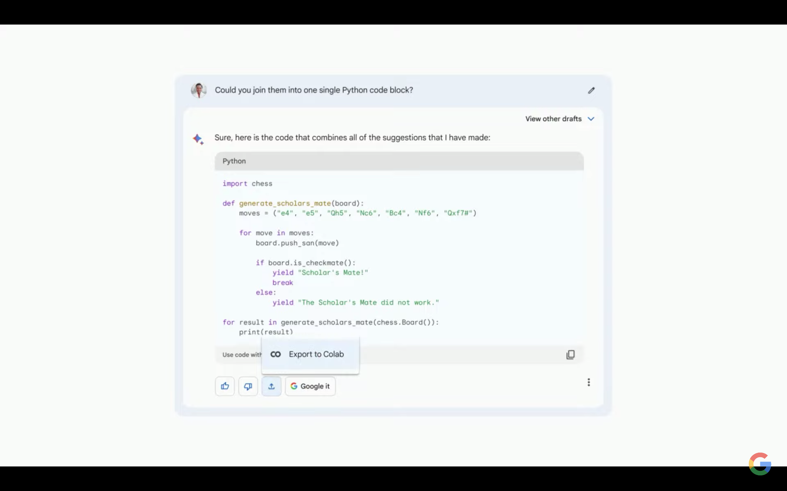 在先前的迭代中,Bard已经能够将Python代码导出到谷歌的Colab。而谷歌正在扩大这一功能,希望将Python代码导出到Replit,使得开发者更容易使用。