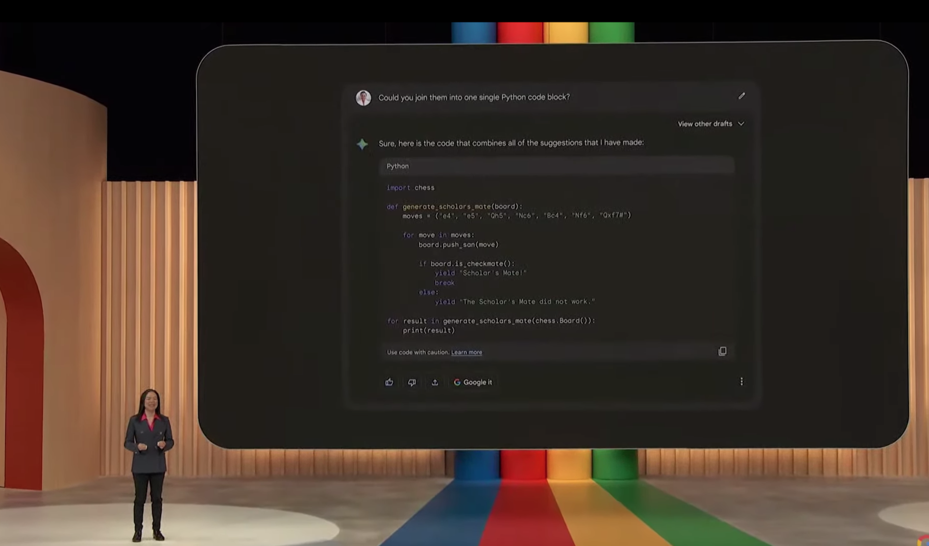 Bard的另一项重大进益在编程侧。谷歌正在增强下一代Bard版本的编程能力,希望Bard不仅能够生成代码,还能够解释一些代码片段并帮助用户调试代码,还希望Bard能具备更强的代码引用能力。