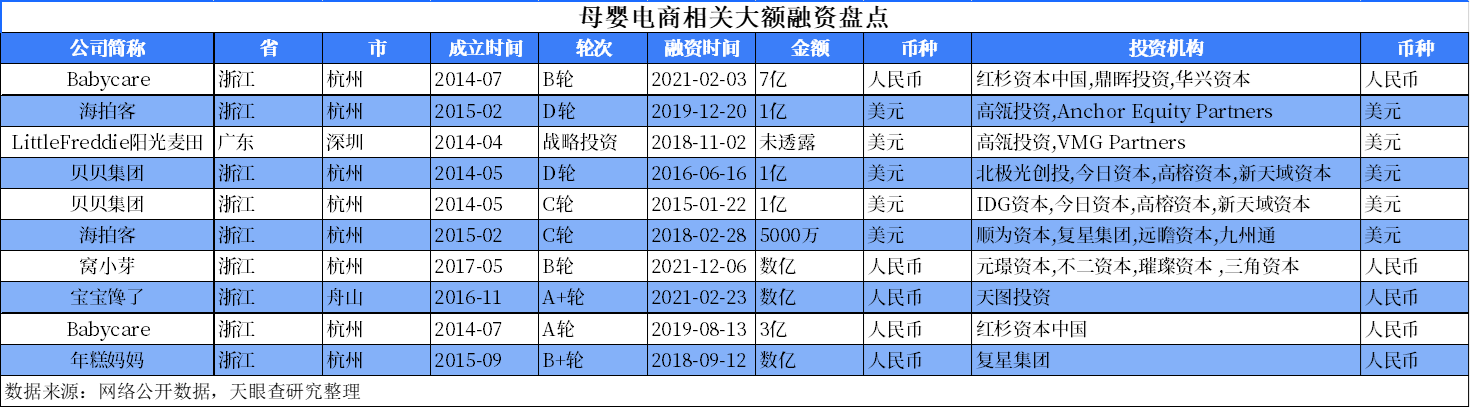 据天眼查不完全统计,母婴电商相关融资合计发生110余起,融资金额超70亿元;