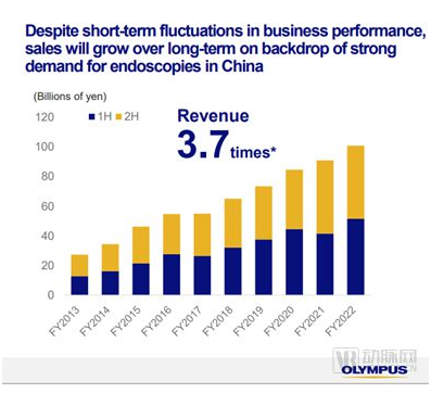 全球巨头的内窥镜业务表现同样亮眼,奥林巴斯来自内窥镜业务营收为4615亿日元,约为34.47亿美元,奥林巴斯在中国市场的营收约为50亿元,并在财报中着重列出对中国市场增长的看好。