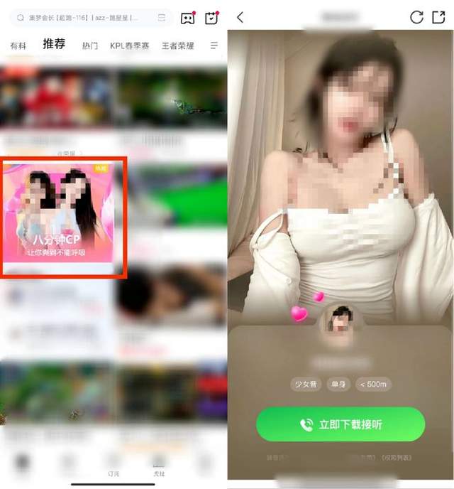 在5月8日当天,燃次元下载虎牙直播APP,打开后首屏推荐界面便有一个疑似打擦边球的广告推送。