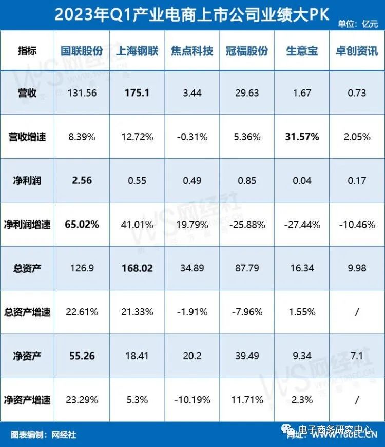 近日,产业电商上市公司中,国联股份(603613.SH)、上海钢联(300226.SZ)、网盛生意宝(002095.SZ)等6家公司陆续发布2023年一季度财报。对此,网经社对这六家公司财报进行解读。