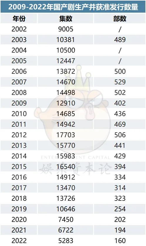 首先,因为“大发展”而一度造成的每年国产剧生产数量庞大。2003年的国产剧年产量首度突破一万集,2012年达到17703集的峰值,部数的高点则是2007年的529部,随着2016年互联网影视大潮以及2018年影视寒冬的袭来,2020年开始国产剧年产量才又跌回万集以内,2022年则仅有160部剧共计5283集。