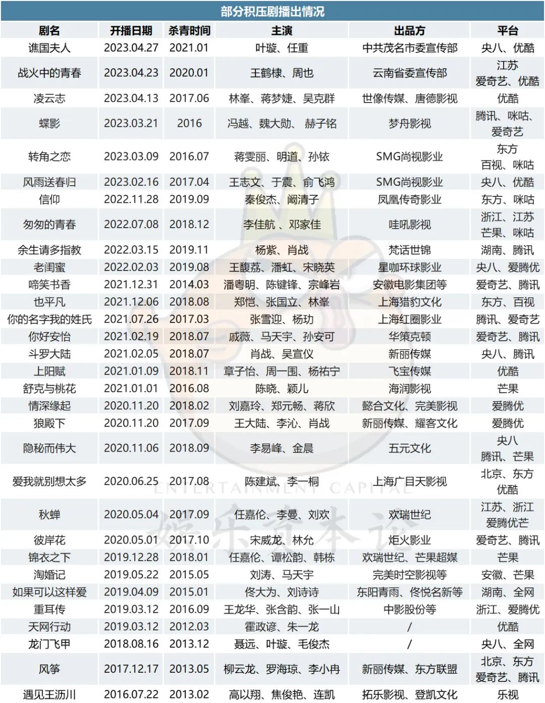 “其实我们做发行的一般不会承认自己手上的剧是积压剧,我们一般叫做发行比较困难。”一名影视公司发行人小景向娱乐资本论(id:yulezibenlun)透露,对于多久没有发行出去会被叫做积压剧也没有一个标准,但根据小景的观察,杀青后两年还未播出的剧集,就会被网友盖章为积压剧,如果杀青三年还没有播出基本就会被坐实是积压剧。
