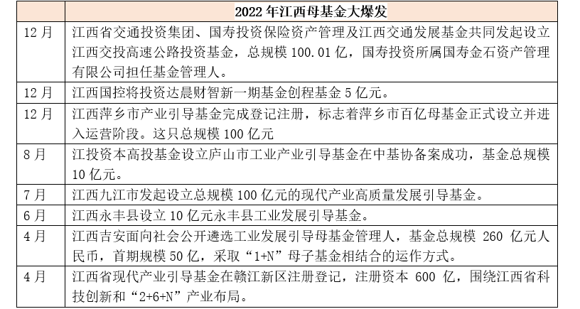 2月份,江西赣江新区“现代产业引导基金”在中国证券投资基金业协会完成备案,由江西江投私募基金管理有限公司担任基金管理人,江西江投资本有限公司、江西省现代产业引导基金和江西国控私募基金管理有限公司共同出资,基金总规模100亿元,重点投资契合赣江新区直管区的高端制造、新型能源、生物医药和数字经济产业等方面产业子基金。