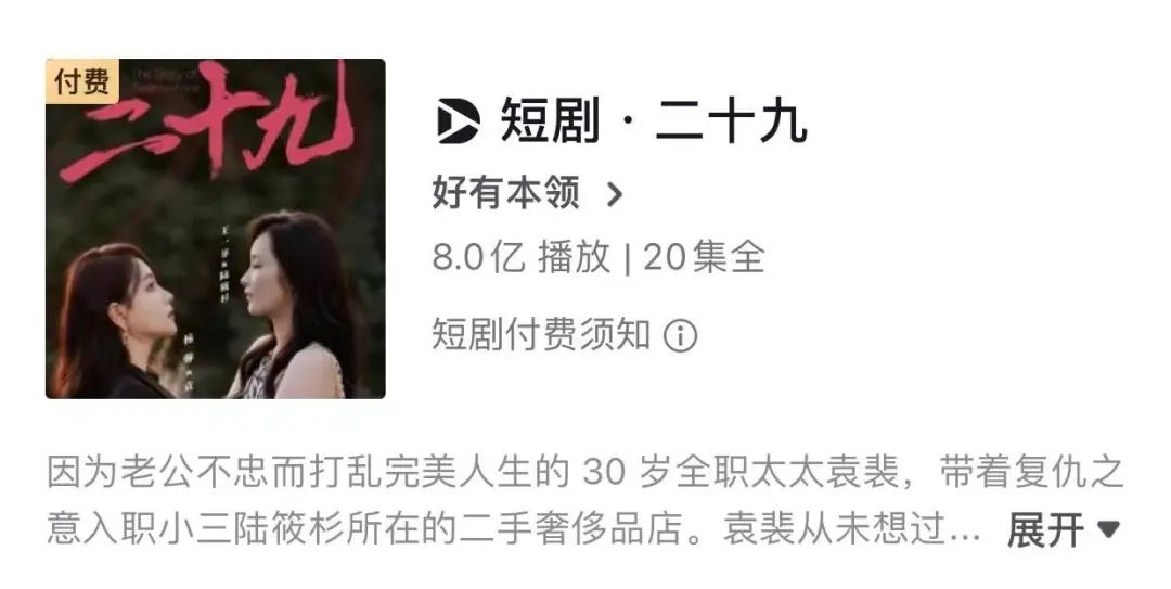 比如,柠萌是少有的、在年报里用较大篇幅写短剧的公司。据年报,年内公司制作并播出了8部短剧,其中5部达到平台流量分成标准,2部播放量超亿次。二零二三年初播出的短剧《二十九》正片总播放量超8亿次,连续四周播放量占据短剧榜第一。短剧也有着更直接的商业模式(品牌定制、流量分成等),和更快的回款周期,这也是各大剧集公司和流媒体平台都在探索的内容形态。
