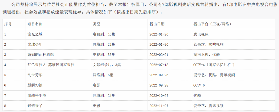 据其2022年年报,公司营业收入和营业毛利主要来源于电视剧《无间》《我们的日子》《香山叶正红》《亲爱的,好久不见》和《火柴小姐和美味先生》等项目的发行收入和毛利,其中《香山叶正红》是一部重大革命历史题材电视剧,而《无间》则是一部年代谍战。