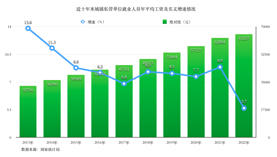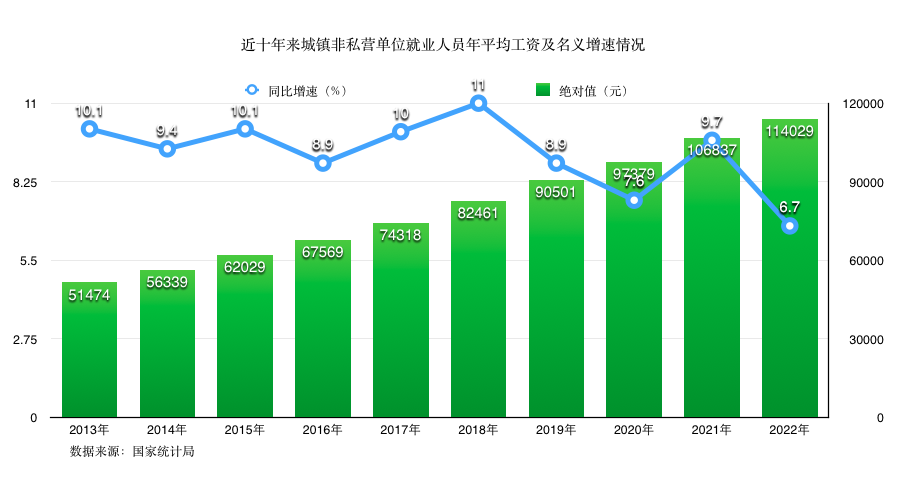国家统计局网站5月9日发布的数据显示,2022年,全国城镇非私营单位就业人员年平均工资为11.4万元,较2021年增长6.7%,增速回落3个百分点,创1984年以来新低,扣除价格因素实际增长4.6%;城镇私营单位就业人员年平均工资为6.5万元,较2021年增长3.7%,增速回落5.2个百分点,创2008年有该指标统计以来的新低,扣除价格因素实际仅增长1.7%。