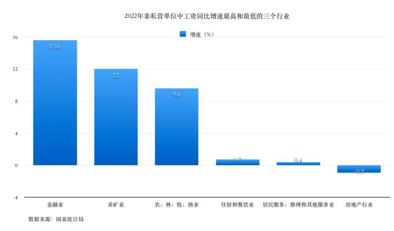 从增速来看,非私营单位中,金融业工资增长最快,平均工资同比增速达到15.6%,采矿业、农、林、牧、渔业紧随其后,增速分别达到12%和9.6%。