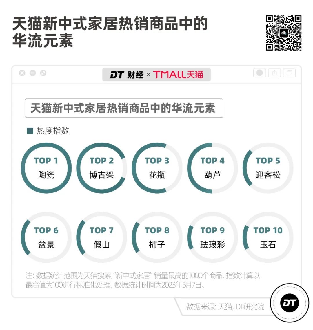 小红书数据显示,#新中式风格的家 话题获得3.4亿浏览量,#中式装修 浏览量1亿,年轻人乐意在充满禅意与木质香气的空间里日常起居。在新中式家居的淘宝热销商品中,陶瓷、博古架、花瓶、葫芦、迎客松等华流元素受欢迎。