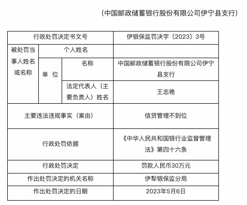 5月11日,伊犁银保监分局行政处罚信息公开表显示,2023年5月6日,中国邮政储蓄银行股份有限公司伊宁县支行因信贷管理不到位,被处罚款人民币30万元。刘炜玮任中国邮政储蓄银行股份有限公司伊宁县支行副行长期间,对信贷管理不到位承担管理责任,受到警告,并处罚款人民币5万元。