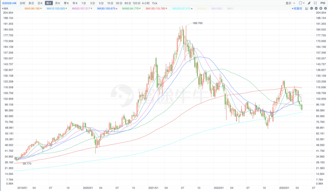 但若拉长时间线看市值,2021年6月29日,安踏总市值达到5023亿港元,时到如今,近乎腰斩。