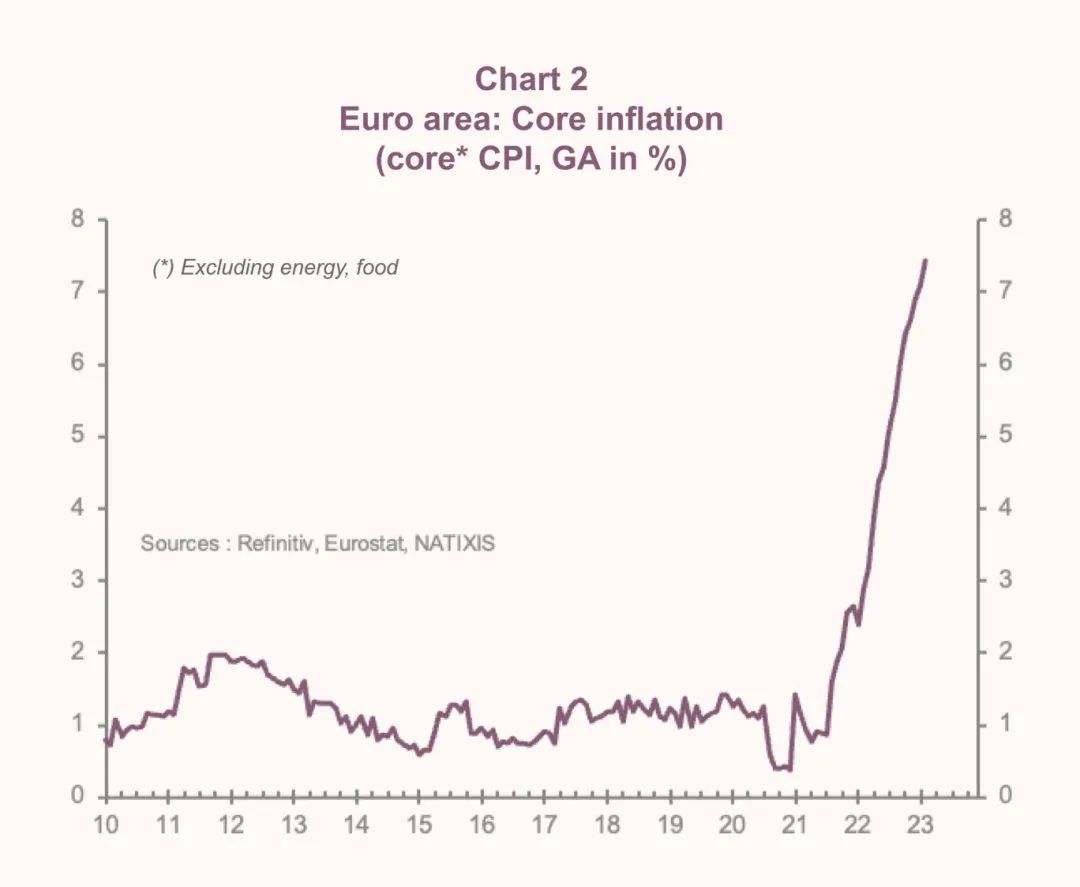 欧元区的核心通胀率(不包括能源和食品的通胀,也不包括租金)在稳步攀升:2021年初不到1%,2022年初升至3%;2022年9月为6.7%,2023年1月升至7.4%。