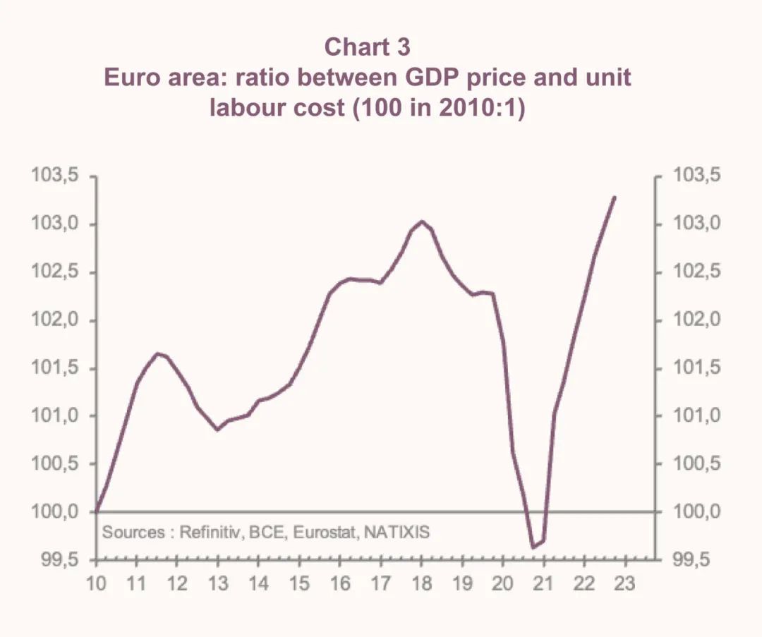 考虑到能源等大宗商品价格如此高昂,欧元区企业利润率仍在攀升这一点着实令人倾佩。当然,企业利润率的攀升也导致了2023年初欧元区通胀率的激增(近两个百分点)。这一现状表明,想让通胀放缓绝非易事,因为通胀会带来工资的进一步上涨,而企业利润率的“追赶效应”也将进一步凸显。