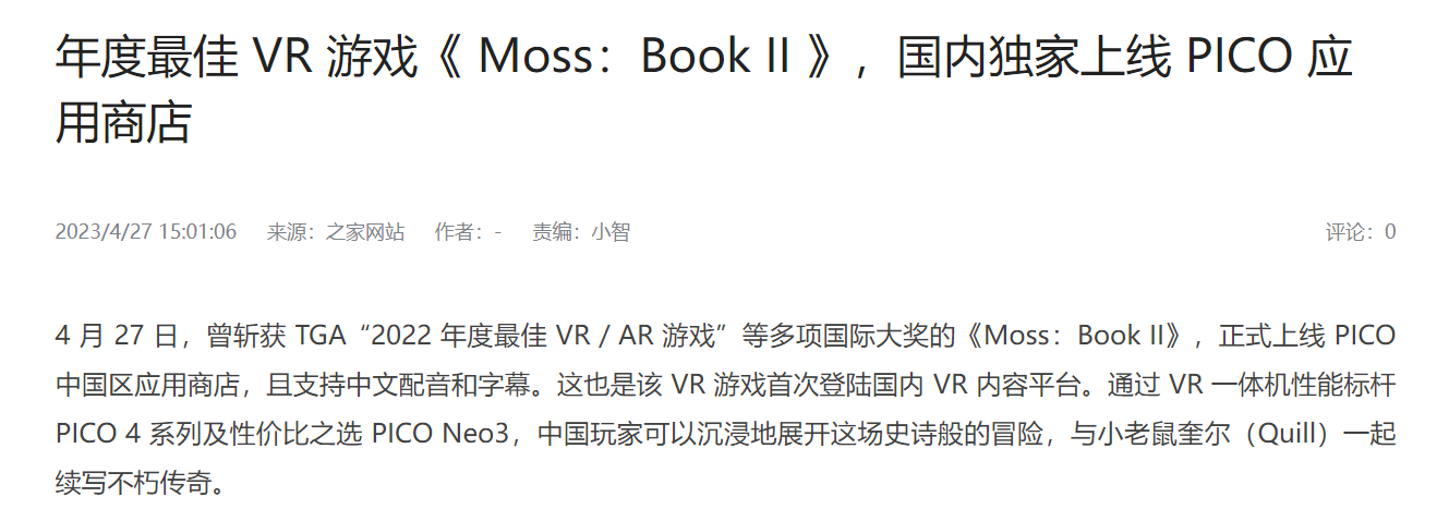 在Pico平台上,显然不缺斩获TGA奖项的名作。但正如前文所述,盗版导致的无利可图与没有版号导致的合规风险,让第三方厂商实质上没有进入中国市场,自然也不存在宣发的动力。