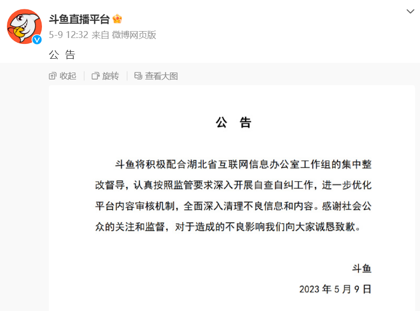 据“网信中国”微信公众号消息,5月8日国家互联网信息办公室指导湖北省互联网信息办公室进驻斗鱼平台开展为期1个月的集中整改督导,原因是该平台存在的色情、低俗等严重生态问题。斗鱼回应称将积极配合,认真整改,进一步优化内容审核机制,全面深入清理不良信息和内容。