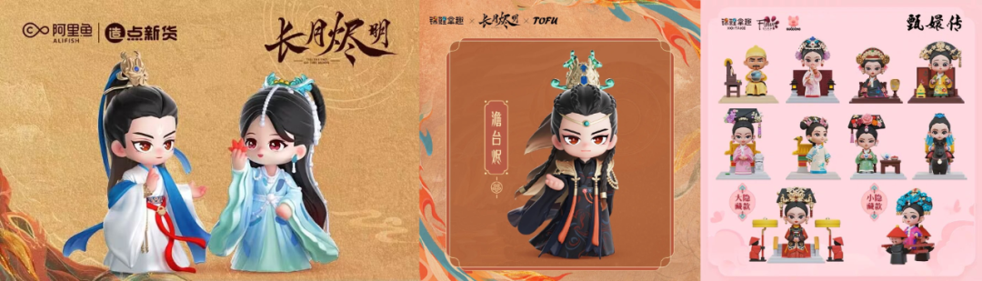 此外,影视剧IP手办强势上榜,在其他大热IP的压力下突出重围。《长月烬明》上清战神冥夜手办还在众筹阶段,成交数已达6350;《长月烬明》官方Q版系列手办月销5000+;《甄嬛传》官方盲盒手办月销1000+,三款周边产品均由阿里旗下的锦鲤拿趣售卖。雷报先前也做过影视剧IP衍生爆款周边的案例分析: “长月烬明”衍生品众筹火出圈,造点新货为什么总能创造IP周边爆卖案例?;《长月烬明》手串销售破千万,吾流文化是怎样成为衍生品爆款制造机的?