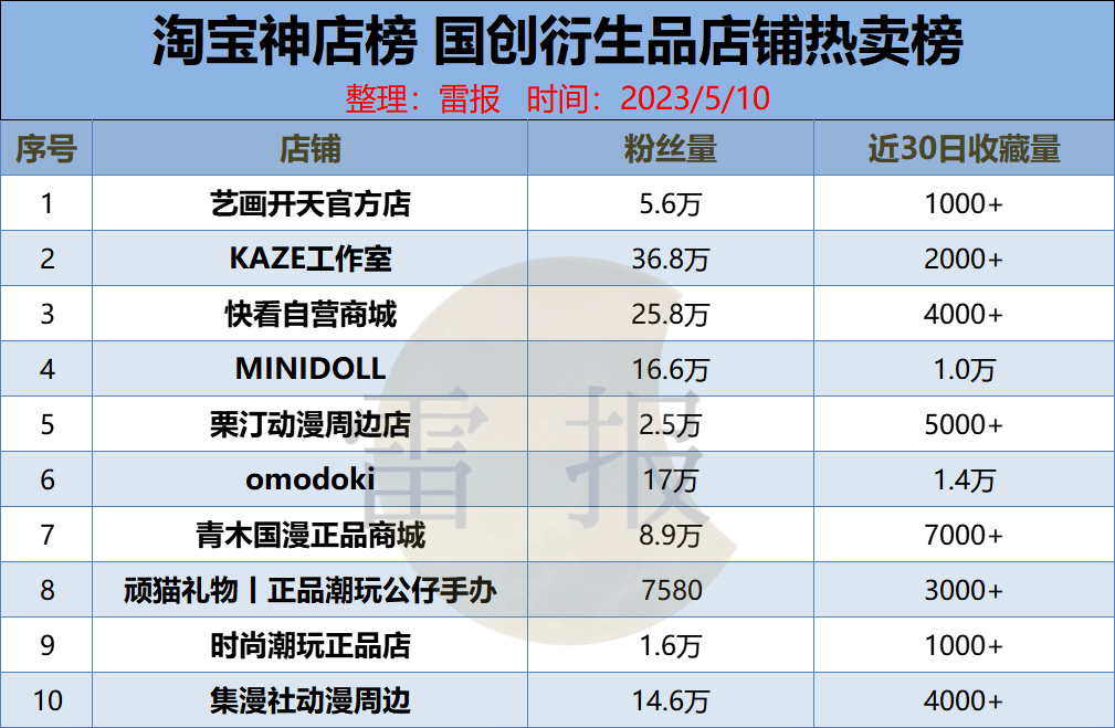 国创衍生品店铺卖榜上,前三名依次是艺画开天官方店、KAZE工作室、快看自营商城,近30日收藏量分别达到了1000+、2000+和4000+。