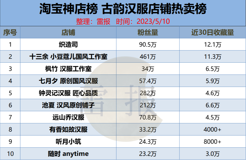 古韵汉服店铺热卖榜上,织造司持续稳坐榜首,粉丝量突破90.5万,近30日收藏达到12.1万,店内销量第一的是宋制飞机袖[山河映画]明制马面裙[吉羊止止]套装。古韵汉服店铺榜单连续数个月来,都由众多“熟面孔”领跑,只是店铺间名次上下有所浮动。