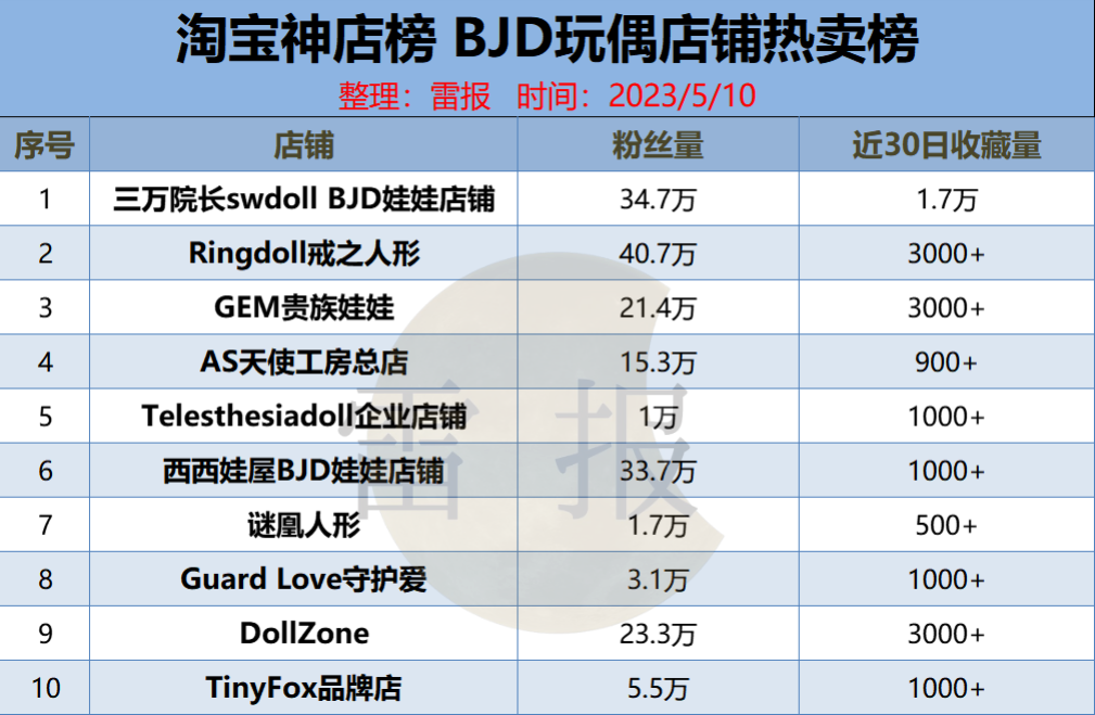 BJD玩偶店铺热卖榜单变化也较小,三万院长swdoll BJD娃娃店铺仍旧蝉联第一,粉丝量34.7万,近30日收藏量有1.7万,店内芋泥自制四分男娃祈司销量第一。榜单第二、三位的分别是Ringdoll戒之人形、GEM贵族娃娃,近30日收藏量均为3000+。