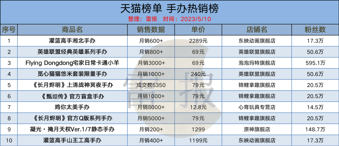 手办热销榜中,灌篮高手湘北手办占据榜首,整套售卖2289元的情况下依旧月销600+,同一IP衍生的山王工高手办名列第十,整套售卖1199元,月销400+。4月20日凌晨,《灌篮高手》大电影在国内上映,虽然是午夜零点场,上座率却超过了80%,截至5月10日,总票房已达6.26亿,动漫粉丝们显然将这股热情带到了周边产品的消费中。