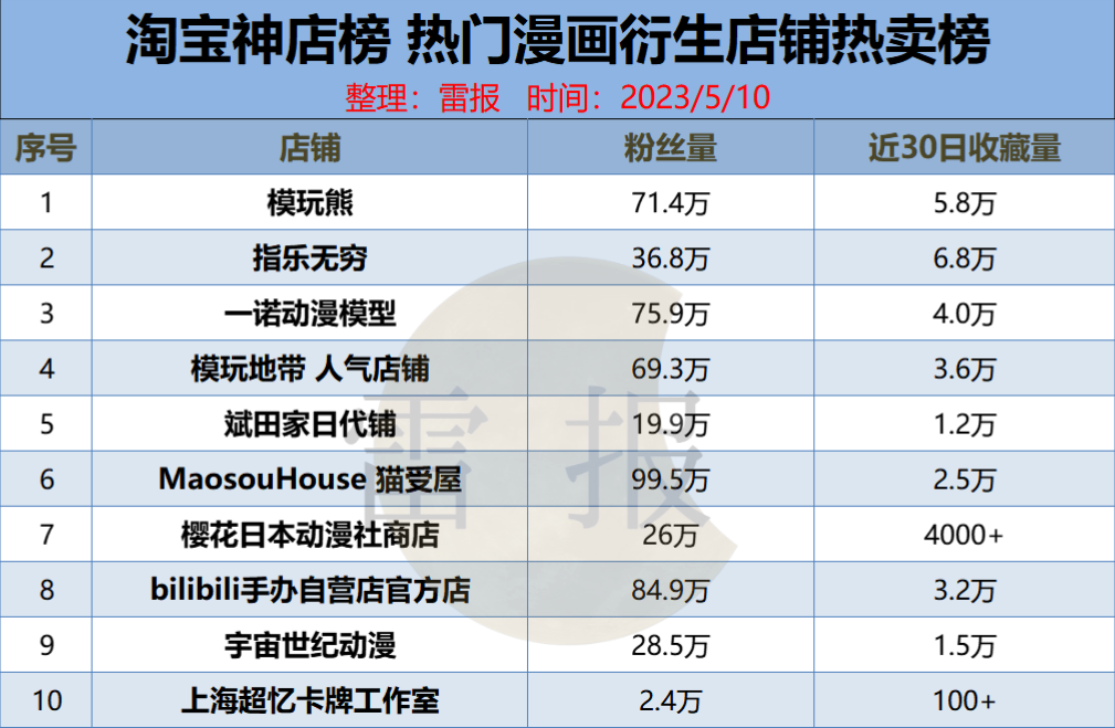 在4月热门漫画衍生店铺热卖榜中,前五名相比3月榜单没有发生变动,依旧是模玩熊、指乐无穷、一诺动漫模型、模玩地带人气店铺、斌田家日代铺五家店铺,近30日获得的收藏量分别为5.8万、6.8万、4.0万、3.6万、1.2万。五家店铺的热销商品均为经典动漫、特摄IP衍生周边。
