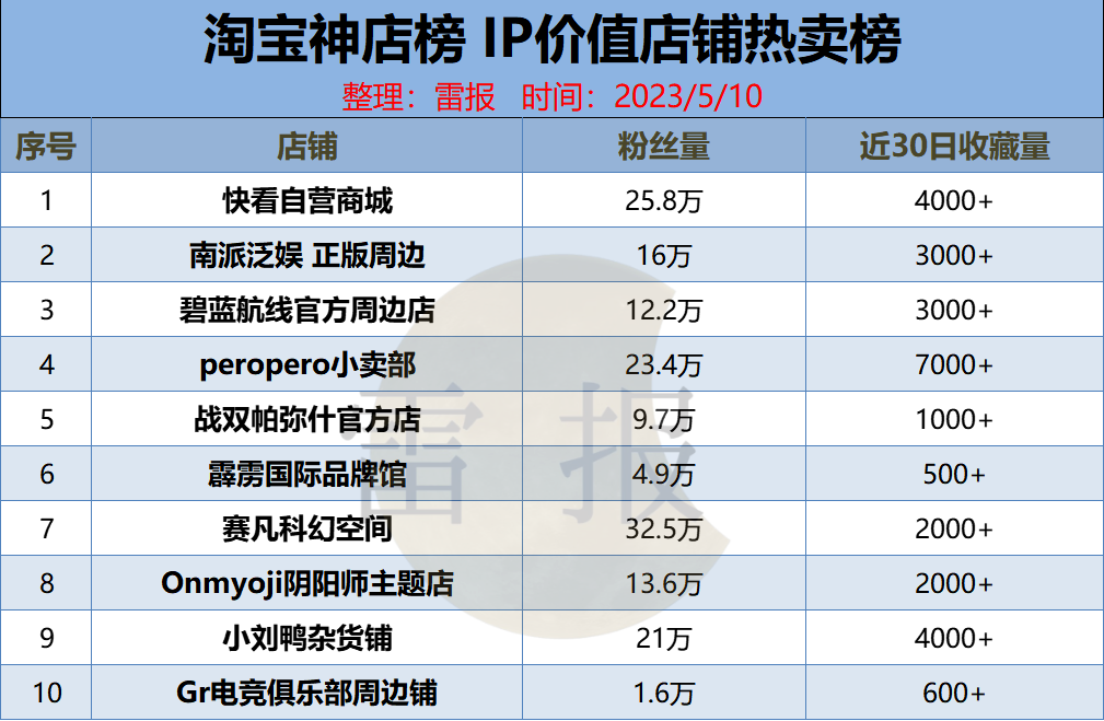 其他登上榜单前十的店铺依次为碧蓝航线官方周边店、peropero小卖部、战双帕弥什官方店、霹雳国际品牌馆、赛凡科幻空间、Onmyoji阴阳师主题店、小刘鸭杂货铺、Gr电竞俱乐部周边铺。