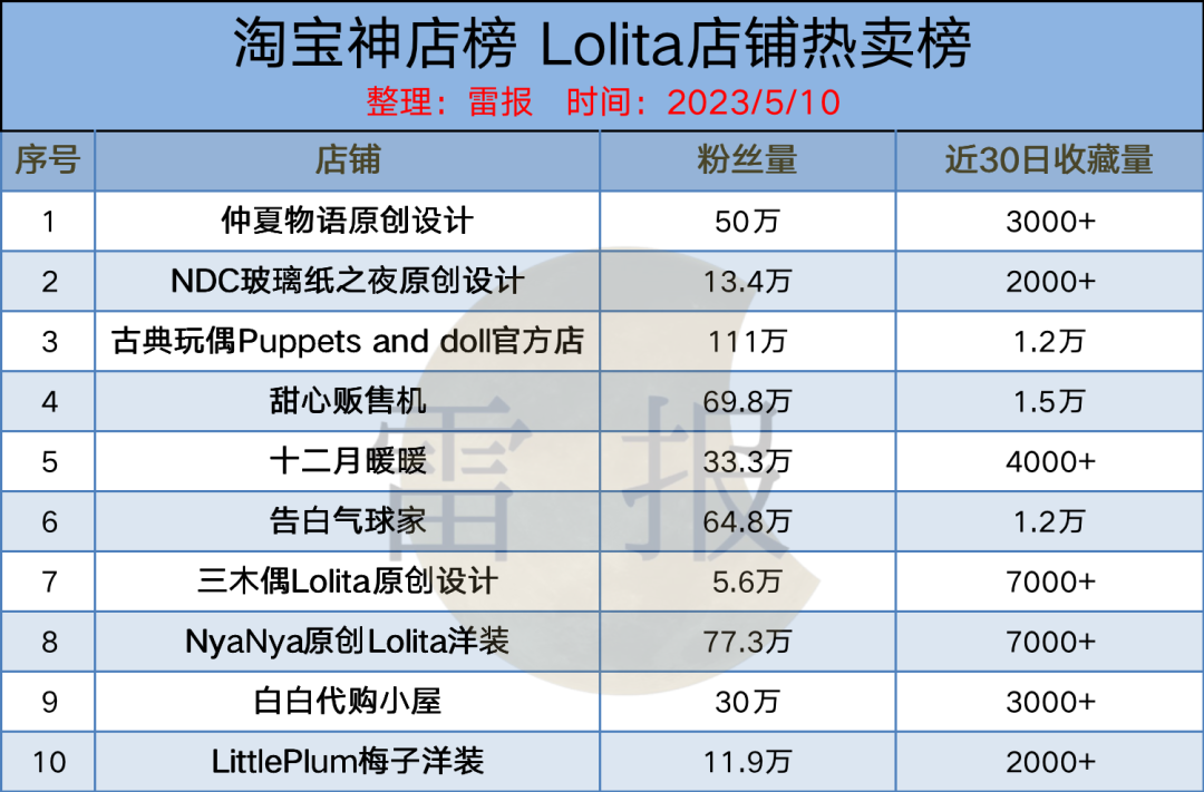在Lolita店铺热卖榜中,仲夏物语原创设计冲至榜一,近30日获得3000+收藏,销量最好的商品是《魔卡少女樱》合作款战斗服Lolita裙,月销600+。第二位为NDC玻璃纸之夜原创设计,近30日获得2000+收藏。数月蝉联榜首的古典玩偶Puppets and Doll排名下降至第三位,近30日收藏量1.2万。