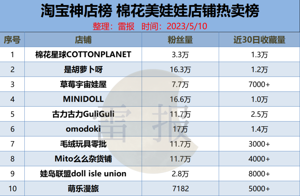 棉花美娃娃店铺热卖榜入榜名单变化不大,此前连续数月蝉联榜首的店铺是胡萝卜呀滑至榜二,棉花星球COTTONPLANET强势登顶,近30日收藏量1.3万,是胡萝卜呀近30日获得1.2万收藏。