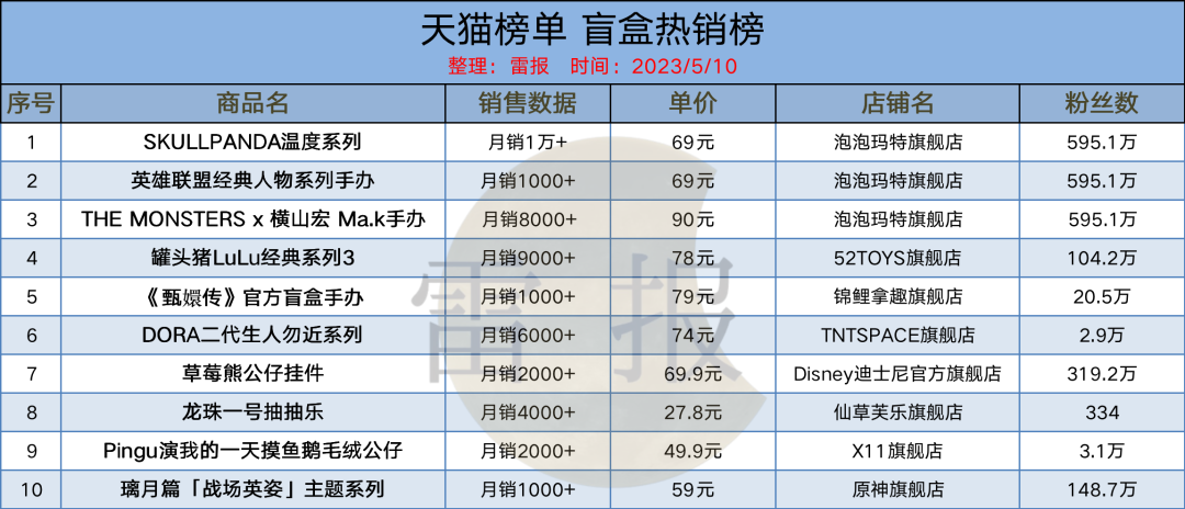 榜单余下第四到十名,分别是罐头猪LuLu经典系列3、《甄嬛传》官方盲盒手办、DORA二代生人勿近系列、草莓熊公仔挂件、龙珠一号抽抽乐、Pingu演我的一天摸鱼鹅毛绒公仔、璃月篇「战场英姿」主题系列。