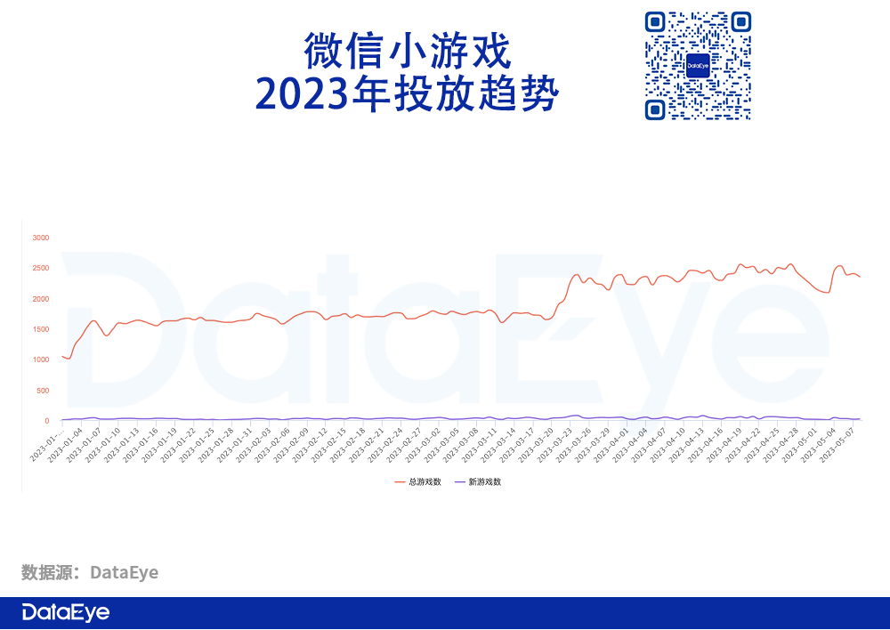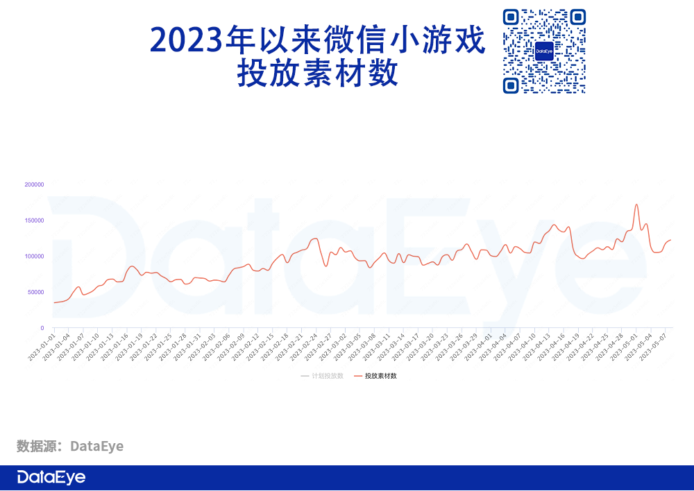 素材量方面,今年以来,微信小游戏投出的素材数量,同样稳步提升,5月1号当天合计达到17万组的高峰。