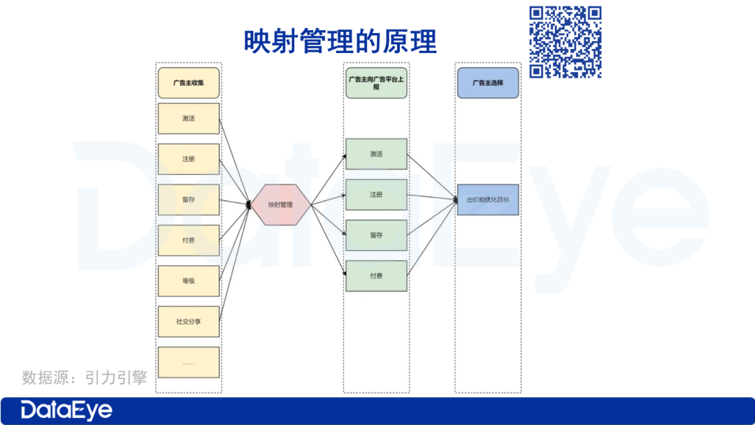 所谓的映射管理指的是在广告主收集用户的激活、注册、留存和付费等行为后,经过一系列逻辑规则管理后向广告平台回传的过程。