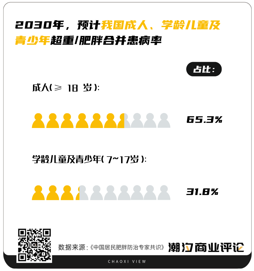 近些年,我国超重和肥胖率持续增加,2022年5月出版的《中国居民肥胖防治专家共识》提及,最新发表的研究预测,至2030年,我国成人(≥ 18 岁)超重/肥胖合并患病率将达到65.3%;学龄儿童及青少年(7~17岁)中将达到31.8%。据统计,预计2022年中国超重及肥胖人数将达到2.26亿人,2025年中国超重及肥胖人数将突破2.65亿人。