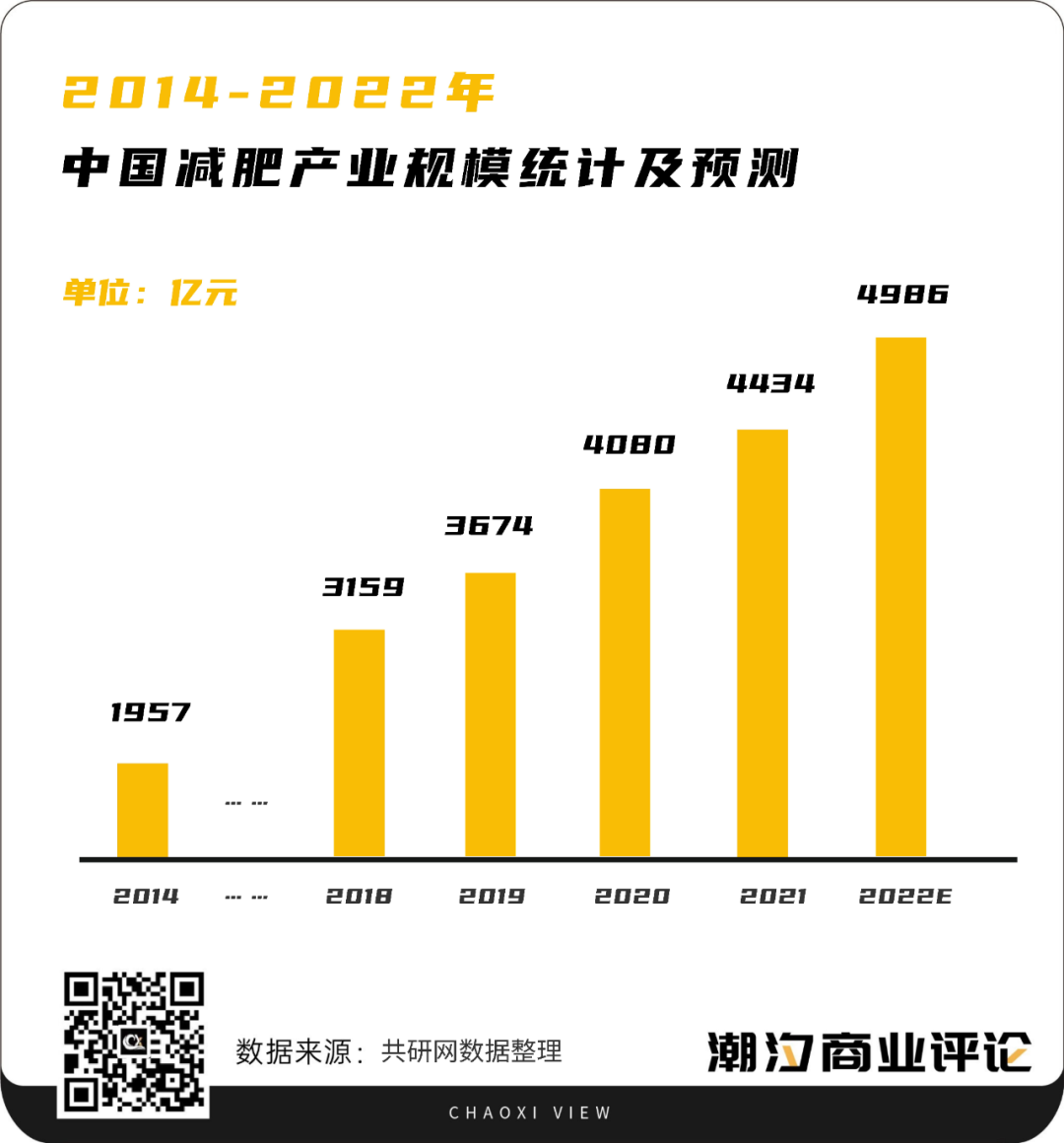 大多数人减肥失败的主要原因是无法坚持,但在花钱减肥这件事上,减肥大军们的恒心却超乎想象。2014年我国减肥产业市场规模达到了1957.6亿元,2021年我国减肥产业规模增至4434.7亿元,预计2022年中国减肥产业规模有望达到4986.4亿元。