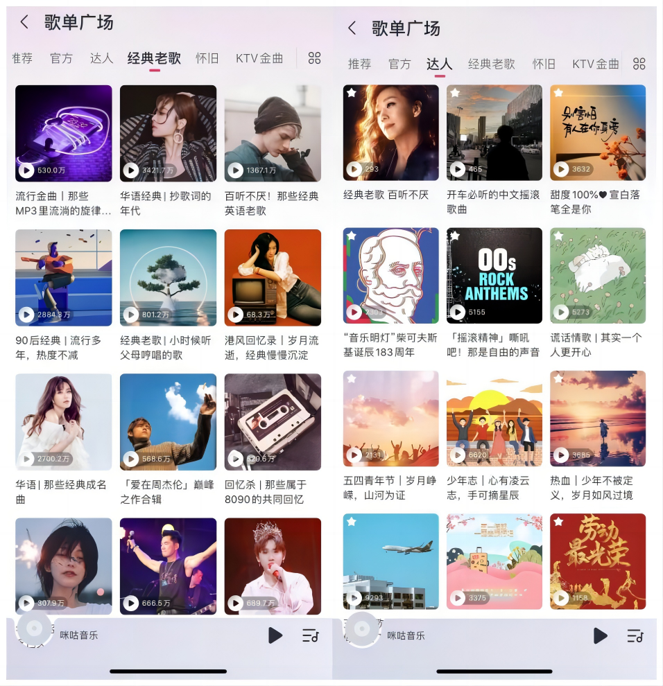 虽然也有歌曲、歌单AI推荐功能,但“现场”一级页面中的音乐视频还是编辑推荐为主,个性化推荐不足;而用户创作积极性方面,“官方”“经典老歌”“怀旧”等版块的热门歌单播放可以上千万,但“达人”歌单中大都只有可怜的几千播放,UGC生态的薄弱可见一斑。