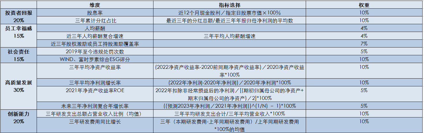 其一是高质量发展,衡量该维度主要分为四个指标,分别为过去三年平均净资产收益率、过去三年平均净利润增长率、2022年扣除非经常损益后的净资产收益率、以及未来三年一致预测的净利润复合年增长率。这四个指标分别代表过去三年内,这家公司的净资产收益率、净利润增长情况,以及未来三年的一致业绩增长性。这部分总权重达30%,各指标占比位10%、10%、5%以及5%。作为重要的盈利性指标,ROE、净利润增长率向来是投资者对于一家上市公司最关心的指标。