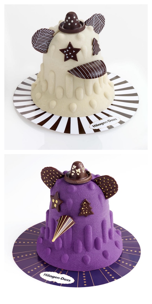 特别款蛋糕有白色与紫色两种口味。前者是盐渍焦糖和香草口味,后者则是杏仁橙花饼干还夹杂了杏仁奶冻和蜂蜜核桃口味的冰激凌。