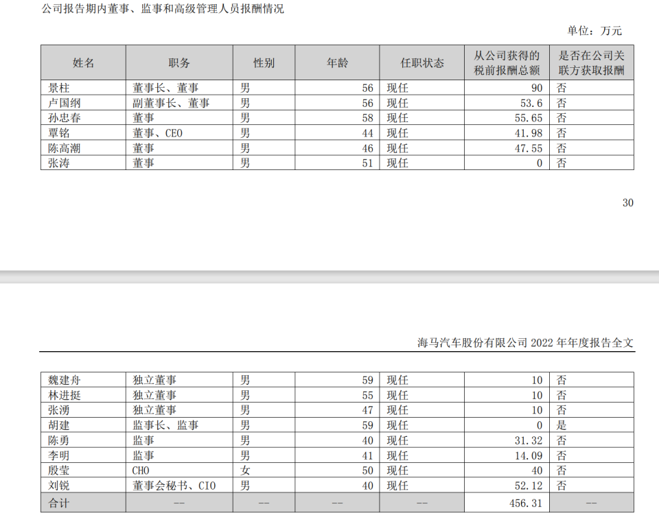 值得关注的是,海马汽车年报显示,报告期内董事、监事、高级管理人员报酬合计456.31万元。董事长、董事景柱从公司获得的税前报酬总额90万元,董事会秘书、CIO刘锐从公司获得的税前报酬总额52.12万元。