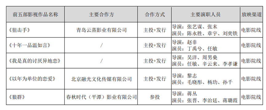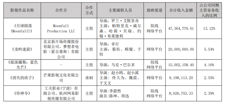 这也符合了华谊从轻到重,又回到内容制作的趋势。只不过而在营收中占比达86.35%的主营业务影视娱乐版块中,报告期内取得收入前5名的影视作品里,一部为网络电影、一部为电视剧、一部为2021年的《侍神令》,电影的比重反而下降了。