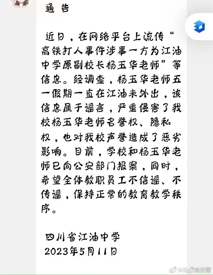 “五一”假期发生的高铁车厢打人事件近日持续引发热议。针对网传打人者之一为四川省江油中学教师一事,2023年5月11日,该校专门发布通告予以辟谣。